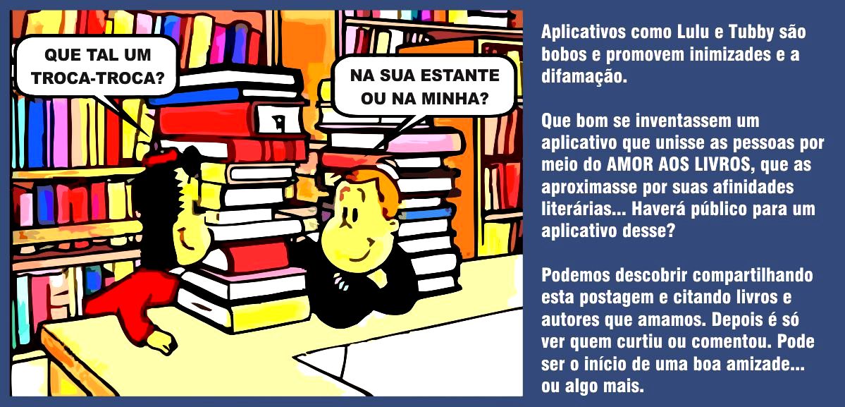 E se alguém inventasse um aplicativo que unisse o desejo de conhecer pessoas com algo mais construtivo que fofocar sobre ex-namorados? Pensei então num aplicativo que aproximasse as pessoas por meio de… livros. Sim, livros, por que não? Afinal, quem gosta de ler procura conhecer pessoas que gostam de ler, e afinidades literárias podem funcionar como catalisador de amizades. Um livro em comum pode até ajudar a iniciar um namoro. Um aplicativo que seguisse essa lógica poderia atrair muita gente e, como o mercado de livros no Brasil está crescendo e tem muito a crescer, certamente livrarias e editoras se interessariam em anunciar, além dos bares que são tematizados em torno da literatura.