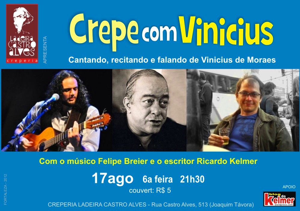 Participação do escritor Ricardo Kelmer e do músico Moacir Bedê na Quinta Poética. A dupla apresentará poemas e músicas de Vinicius de Moraes. Local: Casa das Rosas. Av. Paulista, 37. Prox metrô Brigadeiro. Convênio com o estacionamento Patropi – Alameda Santos, 74. Infs: 11-5904.4499. Apoio: Letra de Bar.