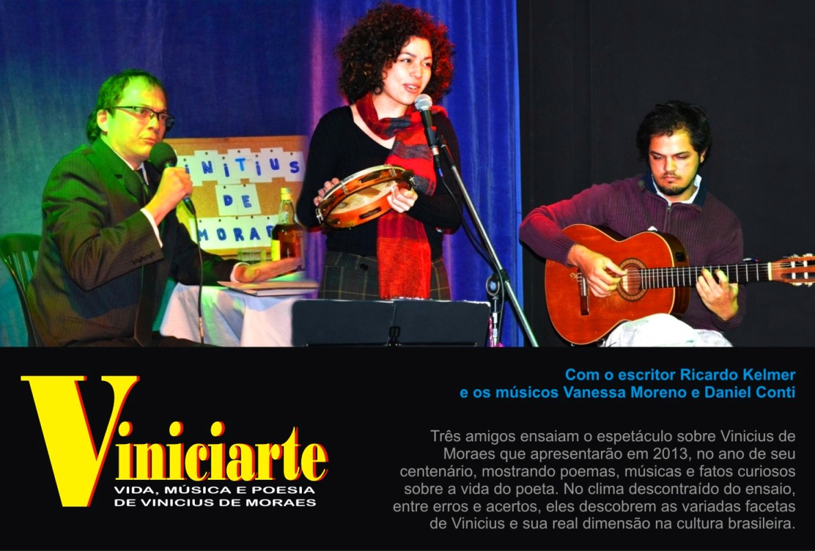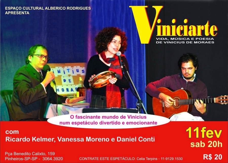 (Esp Cult Alberico Rodrigues – Pinheiros)Apresentação do espetáculo poético-musical Viniciarte – Vida, música e poesia de Vinicius de Moraes. Com o escritor Ricardo Kelmer, o músico Moacir Bedê e a cantora Vanessa Moreno.Três amigos ensaiam o espetáculo sobre Vinicius de Moraes que apresentarão em 2013, no ano de seu centenário, mostrando poemas, músicas e fatos curiosos sobre a vida do poeta. No clima descontraído do ensaio, entre erros e acertos, eles descobrem as variadas facetas de Vinicius e sua real dimensão na cultura brasileira.Realização: Letra de Bar. Local: Espaço Cultural Alberico Rodrigues. Praça Benedito Calixto, 159 – Pinheiros. Reservas: 3064.3920 e 3064.9737. Duração: 1h30. R$ 20 (meia R$ 10)