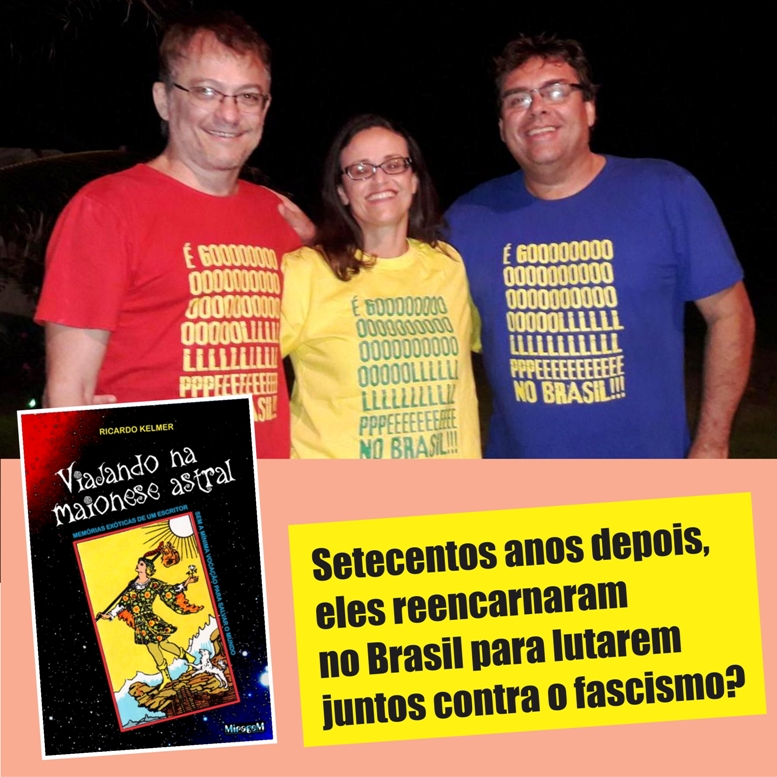 Ricardo Kelmer (Aidon), Ana Claudia Domene (Tata/Orian) e Moacir Bedê (Di Bedis/Andrija), durante a Copa do Mundo de 2018, com a camiseta É Golpe no Brasil!, criada por RK para denunciar o golpe contra a presidenta Dilma Rousseff