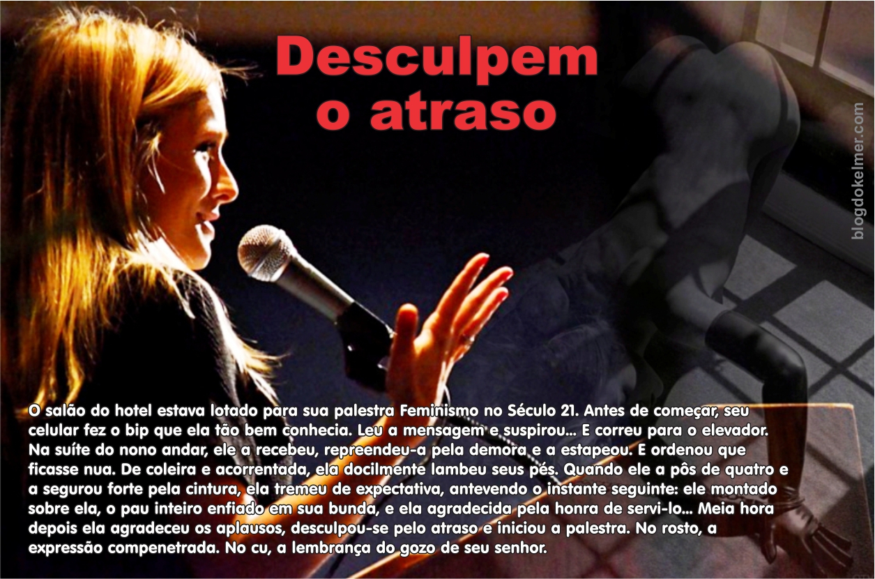 Sua dona a leva pelo corredor do apartamento, puxando-a pela corrente, e Cachorrinha a segue engatinhando, como uma fiel cadelinha deve fazer, e o contato do rabo no interior das coxas lhe provoca arrepios. Na sala, próximo à porta, seu dono as espera. Cachorrinha segue sua dona até lá e para, mantendo-se na posição de docilidade, semiajoelhada, aos mãos no chão.