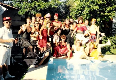 Foto 3: O famigerado trenzinho, 1990. RK, Fred Schlaepffer (de biquinho), Emílio Schlaepffer (a bicha galinha), Marcio Régis (a bicha bêba), Nelsinho Machado (bicha séria), Vicente Vieira (bichinha de óculos) e Fábio Fabão (bicha toda-toda). A bela de chapéu, afff, até hoje não sei quem é esta criatura risonha. Será o Beká?