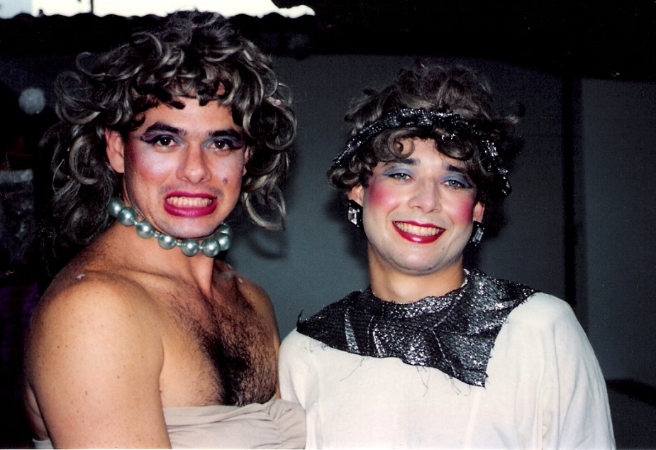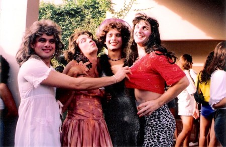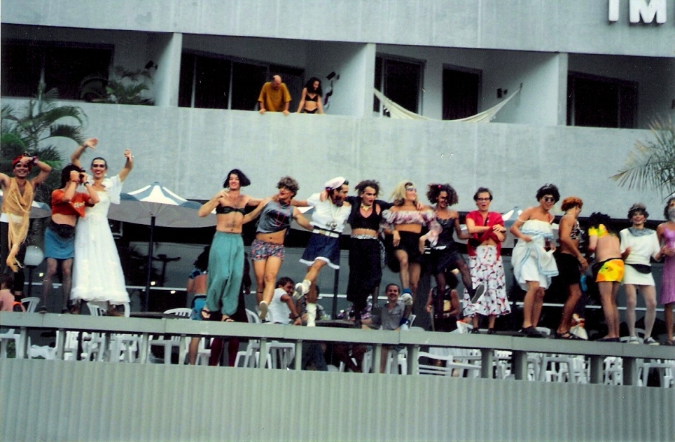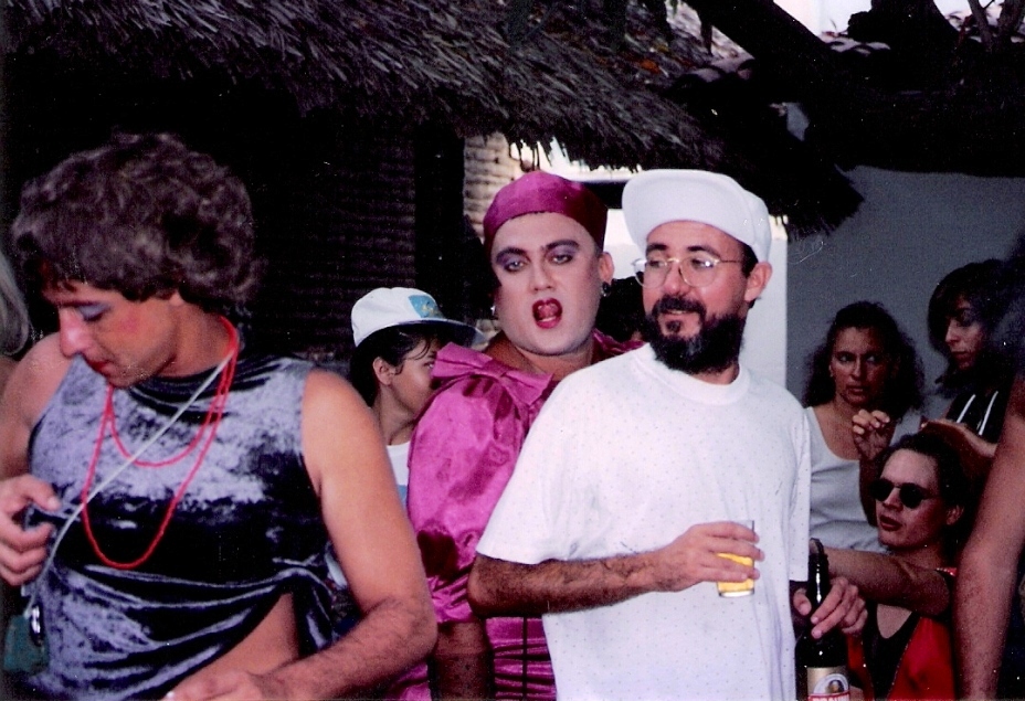 A da esquerda é o Gaúcho, a bicha la playa. A do meio é o Claudio Vignoli, futura bela pizzaiola. E a bela vitaminada da direita é o Fred Schlaepfer. Ao fundo, Romeu Duarte doido pra assumir e Chiquinho Aragão se embriagando pra tomar coragem (1994)