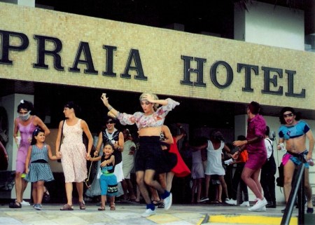Invasão do Imperial Othon Hotel. Em primeiro plano, RK (Angelly Cabrita) segura a peruca enquanto comanda a retirada. À esquerda, Humberto Pinho (Sherazeda) levando o uísque que roubou da mesa de um hóspede. Bem atrás da garotinha aterrorizada, Marcus Braga encarna uma madame levando na coleira seu lindo poodle imaginário. E à direita, Luís Sabadia com a cerveja que ganhou de um turista alemão que se apaixonou por ele – esses gringos têm um mau gosto… (1993)