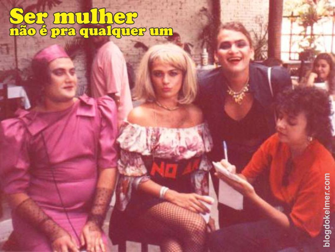 Foto 1: Concentração no bar Suspeito, do lendário Carlinhos Papai, 1993. Valmir Jr (Bela Rainha 1993 com o modelito A Perestroika da Fanta Uva), RK (Angelly Cabrita) e Rian Batista (Inês Fiúza Cover). A repórter é Selma Vidal.