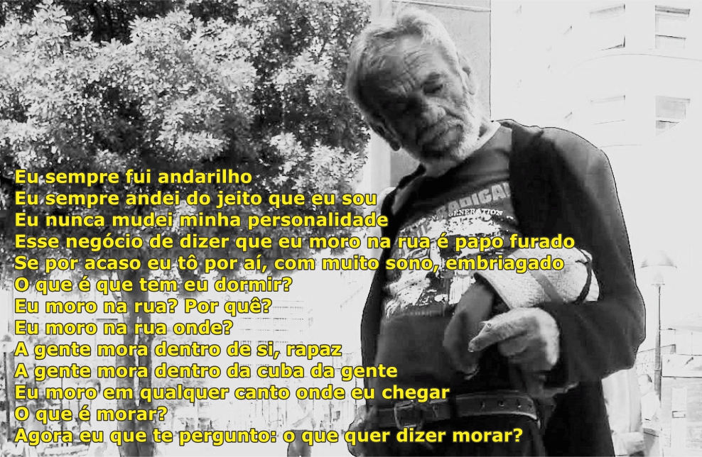 Eu sempre fui andarilho Eu sempre andei do jeito que eu sou Eu nunca mudei minha personalidade Esse negócio de dizer que eu moro na rua é papo furado Se por acaso eu tô por aí, com muito sono, embriagado O que é que tem eu dormir? Eu moro na rua por quê? Eu moro na rua onde? A gente mora dentro de si, rapaz A gente mora dentro da cuca da gente Eu moro em qualquer canto onde eu chegar O que é morar? Agora eu que te pergunto: o que quer dizer morar? .