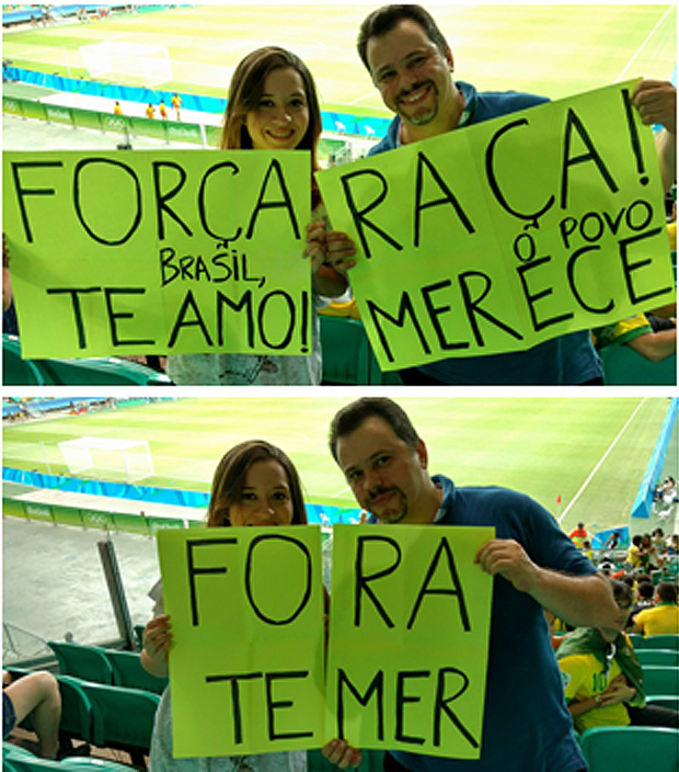 Mas o protesto de maior sucesso nas redes sociais foi o dos amigos Luis Namer, 41, e Naiana Leone, 29. Na quarta 10ago, dia da partida de futebol entre Brasil e Dinamarca, eles levaram dois cartazes à Arena Fonte Nova, em Salvador: Um dizia FOrça Brasil, TE amo!, o outro RAça o povo MERece. Quando dobrados os dois cartazes, aparecia a frase “Fora Temer”. O vídeo da ação viralizou e tem mais de 580 mil visualizações no Facebook. > Mais